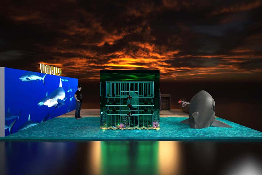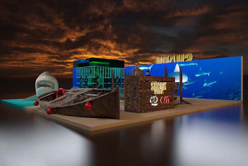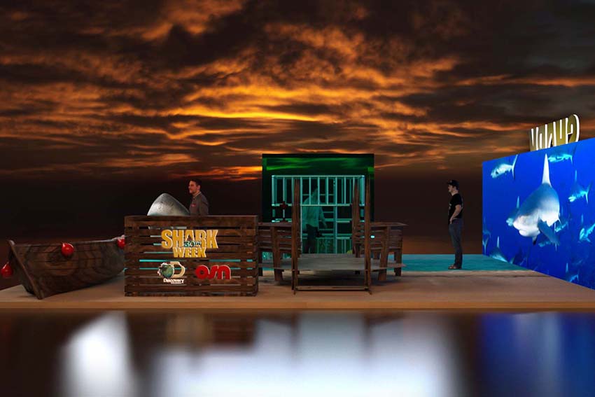 The concept was to bring the essence of the ocean into the mall during Discovery’s Shark Week by creating an island-themed stand. We crafted a unique shark diving cage experience where visitors could immerse themselves in a 3D open water shark diving video using virtual reality (VR) technology.