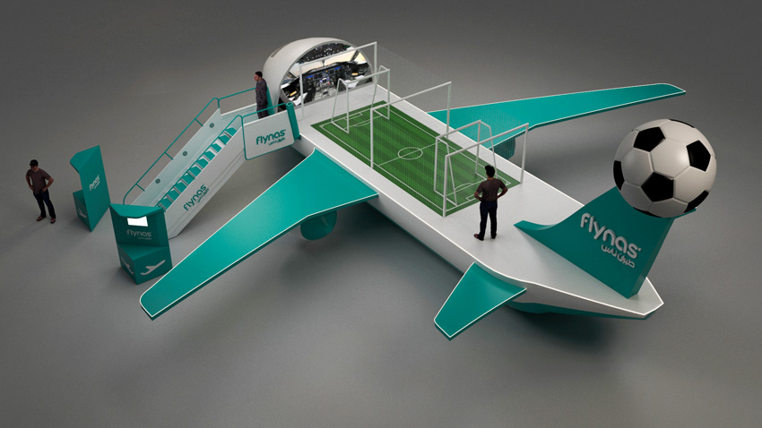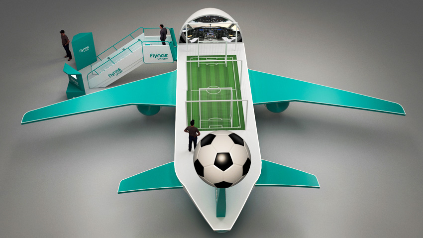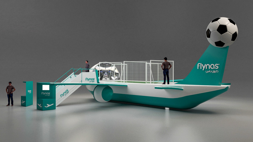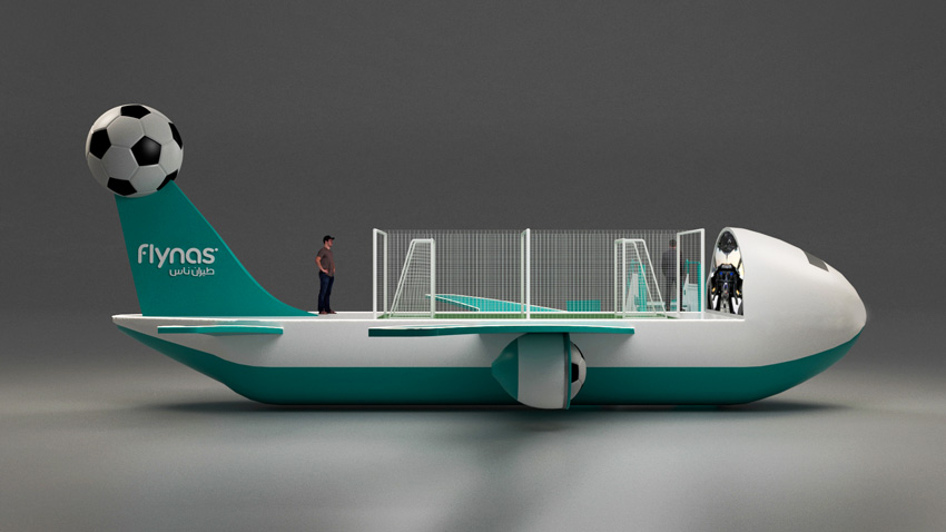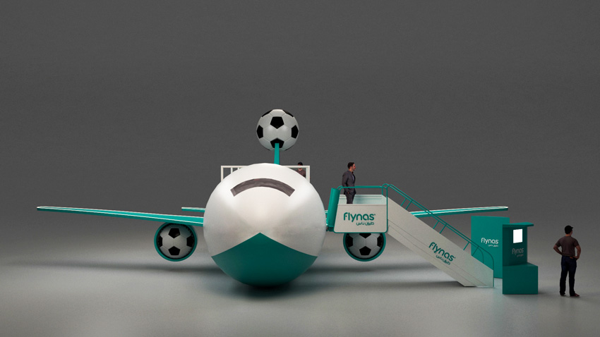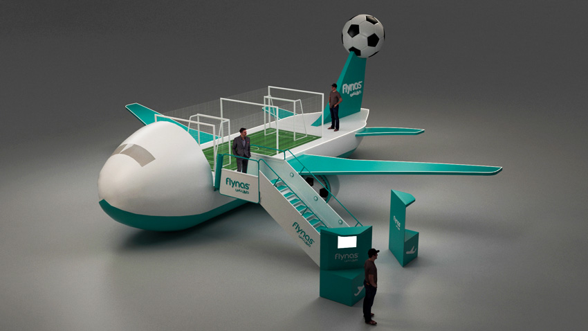 The concept revolves around introducing a miniature Flynas plane into a mall, seamlessly integrated with a Football World Cup theme.